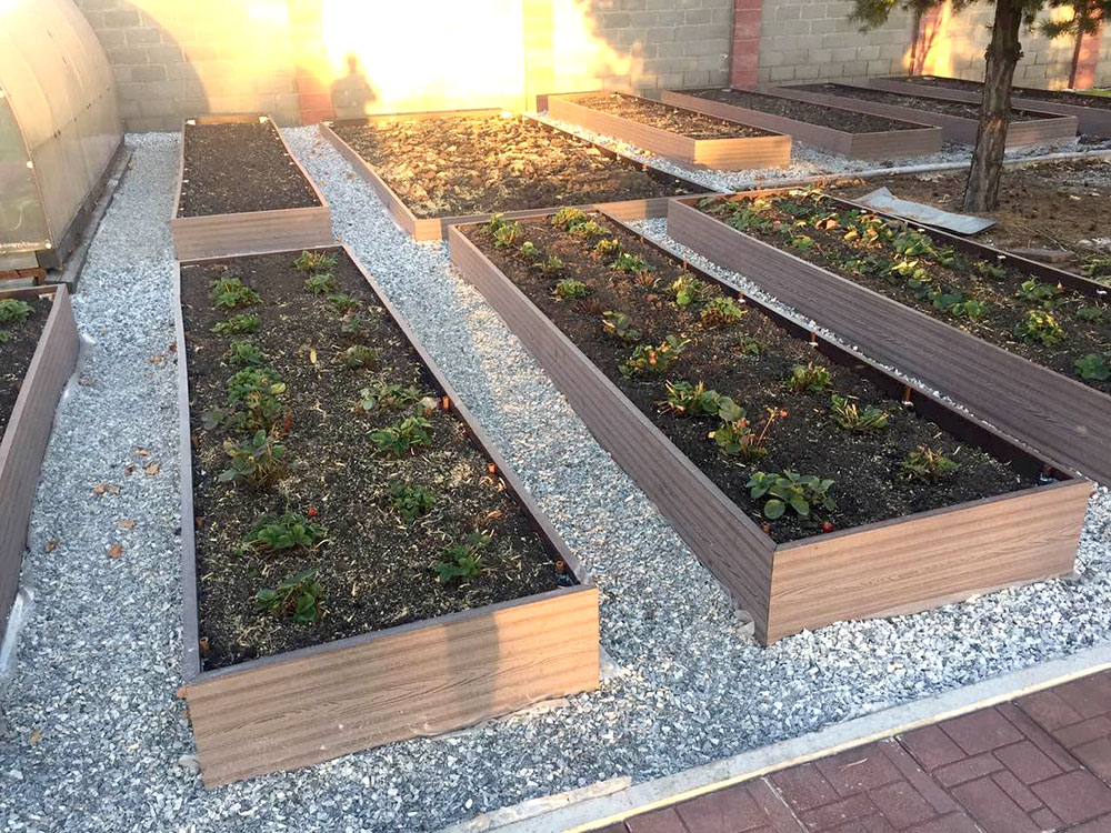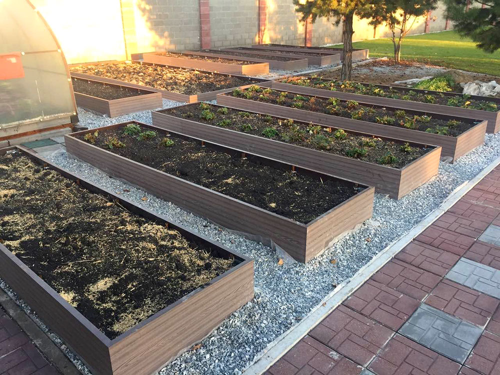 Террасная доска и грядки из ДПК на загородном участке.